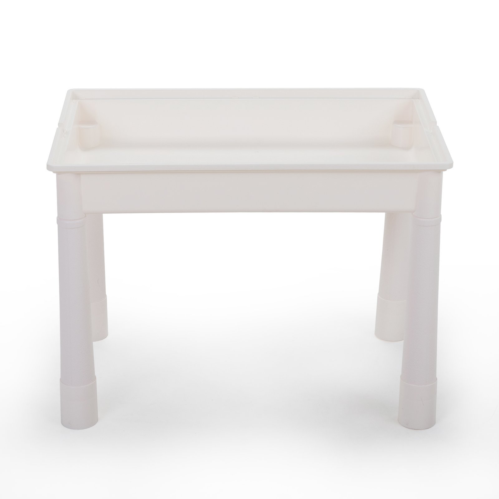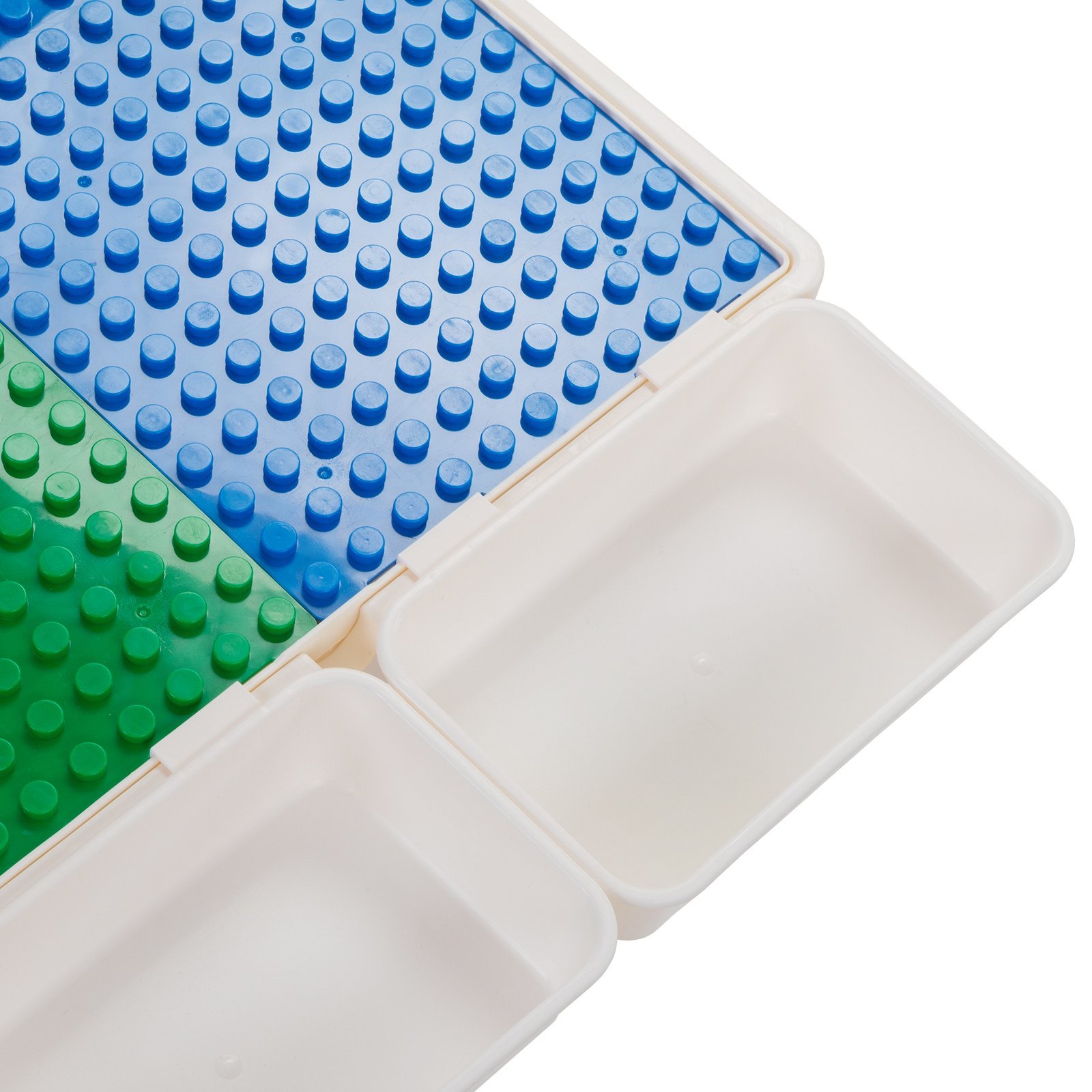 Material: PP; Color of building block table: white table+building block slide (red, blue, yellow, green)+white tabletop+white table legs+white storage box; Color of the square chair: Two square chairs (mixed with yellow, white, ink, and blue) A set of building block table products includes 1 rectangular table, 2 square chairs, 100 building blocks (with 2 ball slides), 4 storage boxes, 4 elevated table cushions, and 8 non slip chair cushions The product includes a full English instruction manual