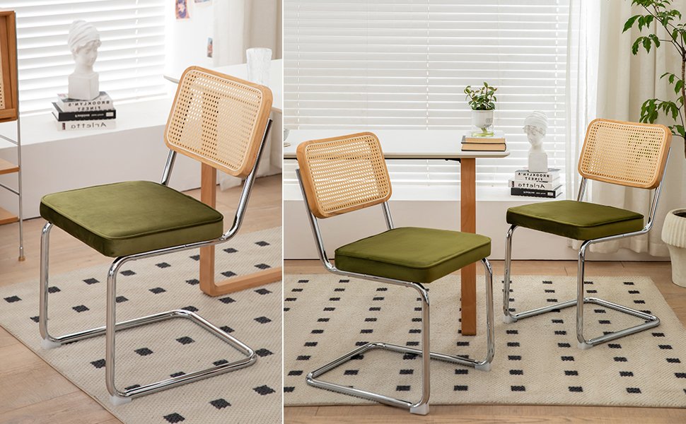 Product Name:Dining Chairs Set of 2, Velvet Rattan Side Accent Chairs with Chrome Legs, Modern Mid Century Breuer Designed Chairs, Upholstered Dining Living Room Kitchen Chairs (Olive Green-2pcs)