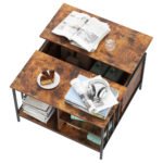 Transform your living space with this versatile lift-top coffee table, designed to be the heart of your home. Crafted with natural wood grain texture and black steel legs, it effortlessly blends farmhouse charm with modern durability. The upgraded spring lift mechanism smoothly raises the tabletop from 20.3″ (coffee table height) to 25.6″ (desk height), making it ideal for remote work, meals, or hobbies—all from the comfort of your sofa. Maximize storage with a large hidden compartment (perfect for toys, blankets, and game consoles) and three open shelves (great for books, decor, and daily essentials). The sturdy steel frame and high-density engineered wood ensure long-lasting stability, supporting up to 110 lbs. Adjustable feet keep it level on uneven floors, while the easy-to-clean surface wipes down in seconds.