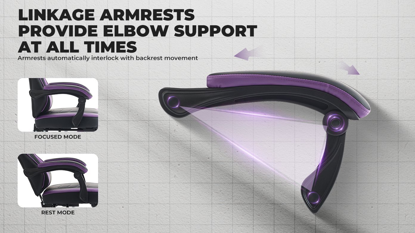 - Upgrade The Linkage Armrest: The game chair uses a 3D linkage armrest design. The armrest is linked to the tilt Angle of the back of the chair. As the back reclines, the armrest is adjusted in sync to ensure full support for the arm at any Angle. This design enhances comfort and greatly improves convenience when using, making the posture more natural and relaxed when playing or working
