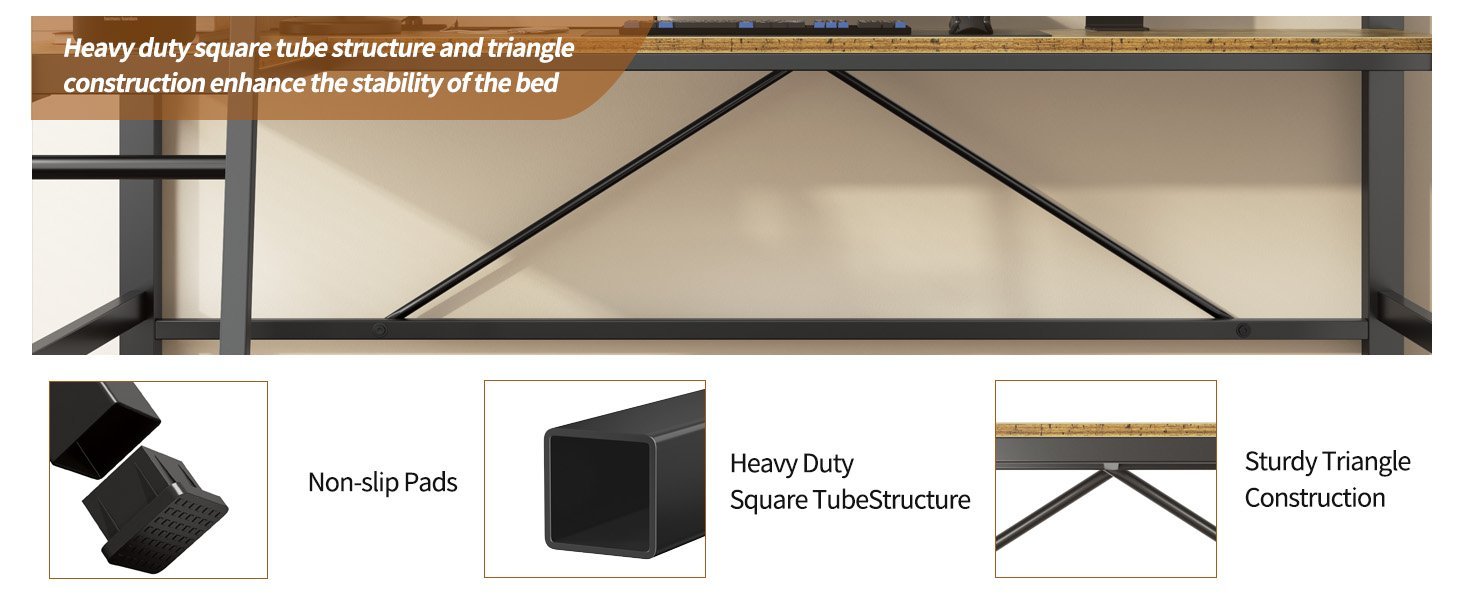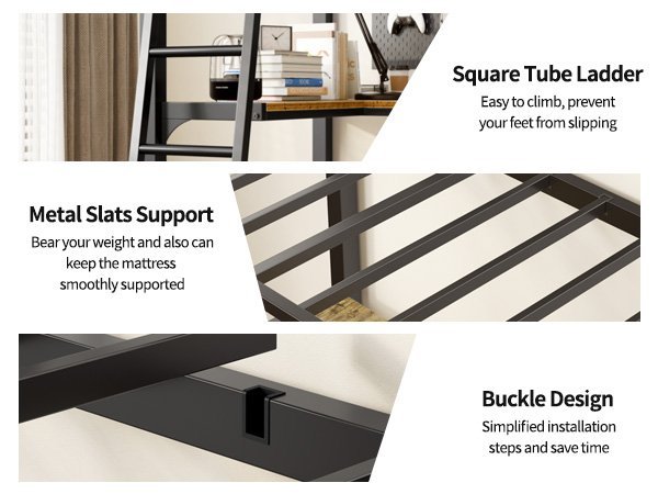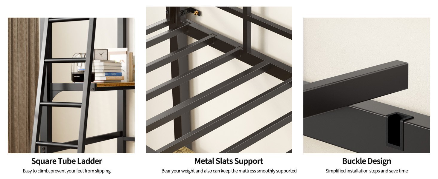 - Adopt a stronger square heavy duty metal frame structure that includes closely packed metal slats. Each component is securely secure with heavy-duty screws and tested to ensure the loft twin bed security and stability.No Box Spring is Needed.The maximum bearing capacity can reach 400 pounds.