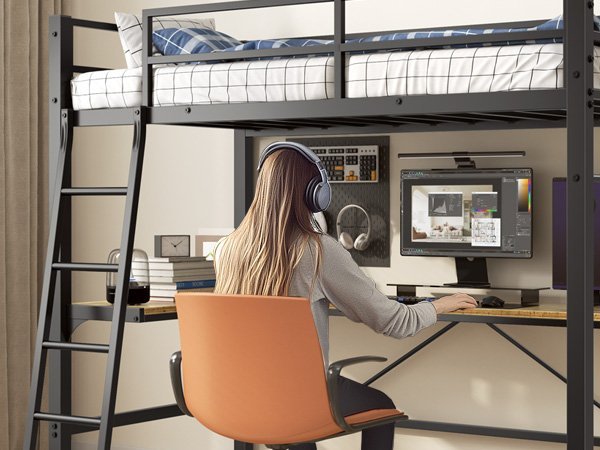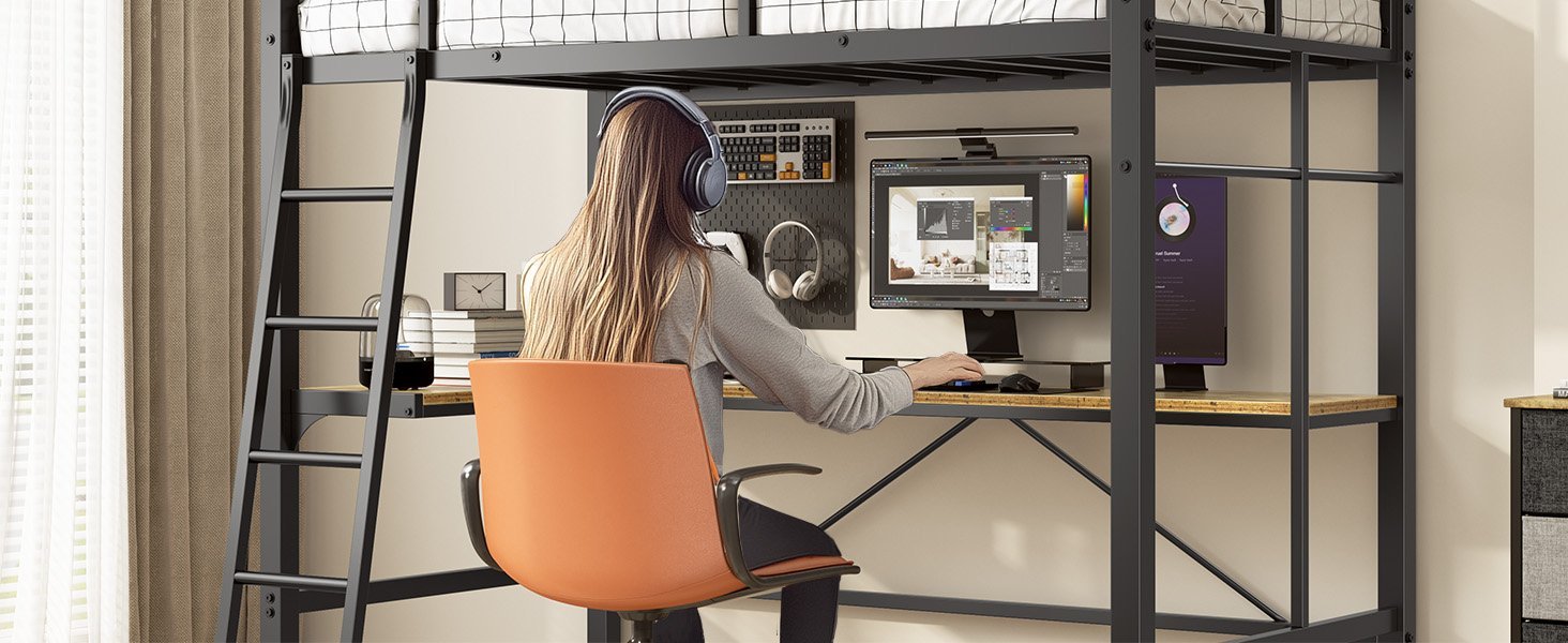 - he twin size loft bed can be configured as two separate spaces. While satisfying rest, the 59.4” space under the top bunk bed provides more personal space for work or leisure. Built-in L-shaped study desk and a charging station in front of the desk,creates a productive, simple work,study or gaming area for your child. Perfect for space-saving needs.