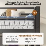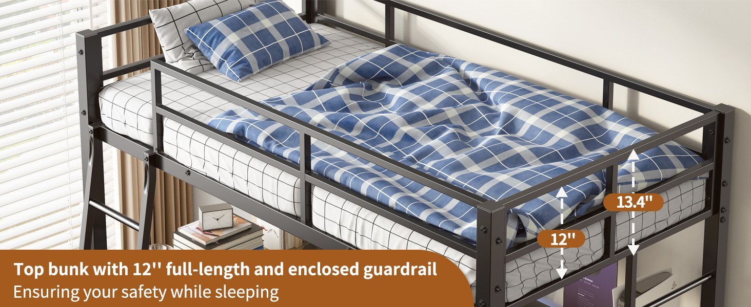 - he top bunk is equipped with full-length and heightened guardrails that not only stabilize the structure of the twin bunk bed but more importantly protect your safety. Note:Make sure the top of the mattress is at least 5” from the edge of the guardrail. Recommended mattress 4-6inch.We provide strong Anti-Tipping Nails to securely fasten the bed to the wall for added safety. The twin size bed leg’s wear-resistant foot pads, prevent any unwanted sliding and eliminate noise