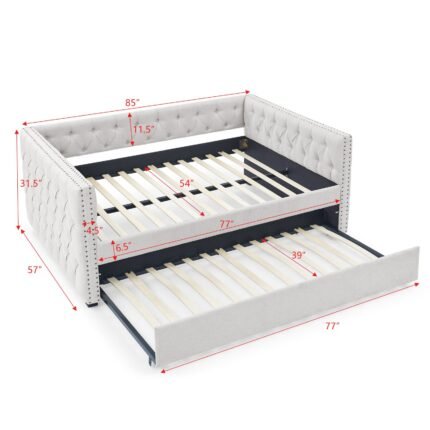 Daybed with Trundle Upholstered Tufted Sofa Bed, with Button and Copper Nail on Square Arms,Full Daybed & Twin Trundle, Beige(85″x57″x31.5″)