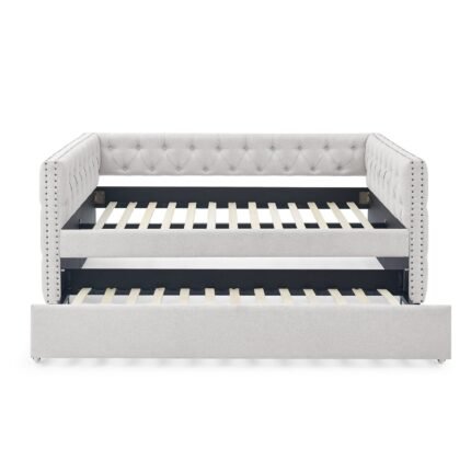 Daybed with Trundle Upholstered Tufted Sofa Bed, with Button and Copper Nail on Square Arms,both Twin Size, Beige(85″x42.5″x31.5″)